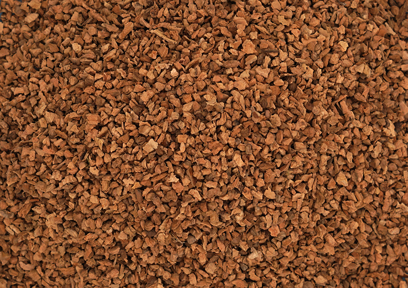 軟木顆粒的原材料是由栓皮、橡木樹皮長至成熟之后,由人工剝落,后進行挑選,留下樹肉彈性好、色澤光亮的樹皮,經切割、捆扎之后送至工廠,后經破碎、數次研磨、風選、分篩之后包裝而成。